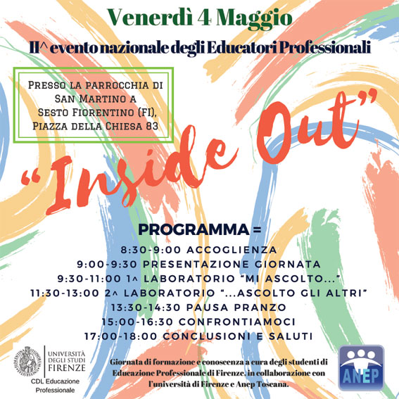 FIRENZE - Venerdì 4 Maggio 2018 a partire dalle 8 e 30 si svolge Inside Out, seconda edizione del seminario nazionale degli Educatori Professionali organizzato dagli studenti del corso di educazione professionale dell’università di Firenze in collaborazione con l’ateneo fiorentino e Anep Toscana. La giornata di formazione e conoscenza è ospitata nella parrocchia di San Martino a Sesto Fiorentino (FI).