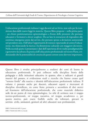 L’educazione professionale italiana è oggi davanti ad un bivio, non solo per la transizione data dalle nuove leggi in materia. Questo libro propone – nella prima parte - un chiaro posizionamento epistemologico a fronte delle pressioni che portano educatori e formatori a dover scegliere. Da un lato la tentazione di rispondere alle continue emergenze poste dai servizi, che portano spesso a deviazioni assistenziali nel prendersi cura. Dall’altra l’opportunità di resistere riportando al centro l’educazione, ma rilanciando la ricerca e la dimensione culturale con maggiore decisione.